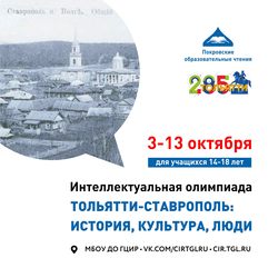 Интеллектуальная олимпиада «Тольятти-Ставрополь: история, культура, люди» для учащихся 14-18 лет проводилась с 03-13 октября 2022 г. на дистанционной платформе сайта МБОУ ДО ГЦИР. В олимпиаде приняли участие 316 старшеклассников из 17-ти образовательных организаций (№№ 1, 9, 11, 13, 26, 31, 32, 33, 40, 47, 51, 58, 70, 74, 79, 90, ГЦИР). Победителями и призерами олимпиады стали 140 участников.